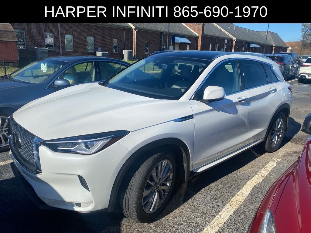 Harper INFINITI is excited to offer this terrific-looking 2025 INFINITI QX50 in Radiant White HARPER INFINITI believes in the quality of the vehicles we sell so well that we provide an UNLIMITED MILES, POWERTRAIN WARRANTY on every new and qualifying pre-owned vehicle it sells!!! This warranty is good at any ASE certified shop in the 48 continental United States!! Check out all these great options 4-Wheel Disc Brakes, 6 Speakers, ABS brakes, Air Conditioning, Alloy wheels, AM/FM radio: SiriusXM, Auto High-beam Headlights, Auto-dimming Rear-View mirror, Automatic temperature control, Bose 12-Speaker Premium Audio, Brake assist, Bumpers: body-color, CD player, Delay-off headlights, Driver door bin, Driver vanity mirror, Dual front impact airbags, Dual front side impact airbags, Electronic Stability Control, Emergency communication system: INFINITI InTouch (1-year complimentary trial), Exterior Parking Camera Rear, Four wheel independent suspension, Front anti-roll bar, Front Bucket Seats, Front Center Armrest, Front dual zone A/C, Front reading lights, Fully automatic headlights, Garage door transmitter: HomeLink, Heated door mirrors, Heated Front Bucket Seats, Heated front seats, Illuminated entry, Illuminated Kick Plates, Knee airbag, Leather Shift Knob, Leather steering wheel, Leather-Appointed Seat Trim, Low tire pressure warning, Memory seat, Occupant sensing airbag, Outside temperature display, Overhead airbag, Overhead console, Panic alarm, Passenger door bin, Passenger vanity mirror, Power door mirrors, Power driver seat, Power Liftgate, Power moonroof, Power passenger seat, Power steering, Power windows, Radio data system, Radio: HD Audio System, Rear anti-roll bar, Rear Parking Sensors, Rear reading lights, Rear seat center armrest, Rear side impact airbag, Rear window defroster, Rear window wiper, Remote keyless entry, Security system, Speed control, Speed-sensing steering, Speed-Sensitive Wipers, Splash Guards (Set of 4), Split folding rear seat, Spoiler, Steering wheel mounted audio controls, Tachometer, Telescoping steering wheel, Tilt steering wheel, Traction control, Trip computer, Turn signal indicator mirrors, Variably intermittent wipers, and Wheels: 19" Silver Painted Aluminum Alloy.
