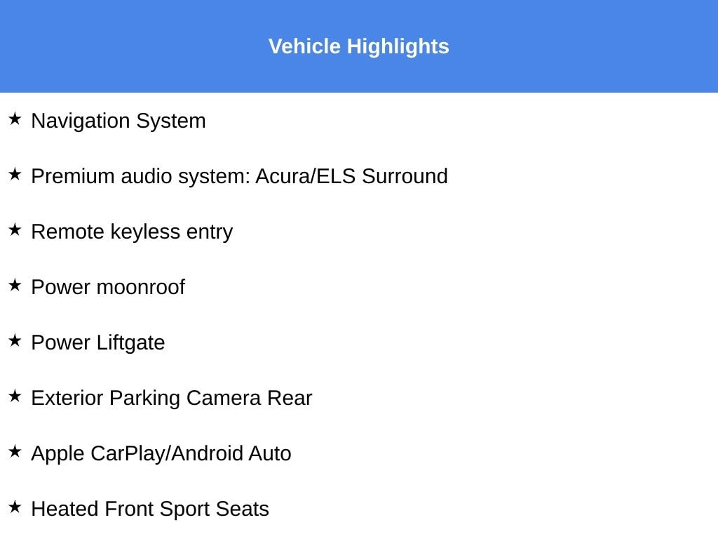 HARPER ACURA believes in the quality of the vehicles we sell so well that we provide an UNLIMITED MILES POWERTRAIN WARRANTY on every new and qualifying pre-owned vehicle it sells!!! This warranty is good at any ASE certified shop in the 48 continental United States!! Check out all these great options Apple CarPlay/Android Auto, Exterior Parking Camera Rear, Heated Front Sport Seats, Navigation System, Power Liftgate, Power moonroof, Premium audio system: Acura/ELS Surround, Remote keyless entry, Wheels: 20" x 8" Shark Gray Twisted 10-Spoke, 10 Speakers, 3rd row seats: bench, 4-Wheel Disc Brakes, 4.33 Axle Ratio, ABS brakes, Air Conditioning, Alloy wheels, AM/FM radio: SiriusXM, Anti-whiplash front head restraints, Audio memory, Auto High-beam Headlights, Auto tilt-away steering wheel, Auto-dimming Rear-View mirror, Automatic temperature control, Brake assist, Bumpers: body-color, CD player, Compass, Delay-off headlights, Driver door bin, Driver vanity mirror, Dual front impact airbags, Dual front side impact airbags, Electronic Stability Control, Emergency communication system, Four wheel independent suspension, Front anti-roll bar, Front Bucket Seats, Front Center Armrest, Front dual zone A/C, Front reading lights, Garage door transmitter: HomeLink, Genuine wood console insert, Genuine wood dashboard insert, Genuine wood door panel insert, Heated door mirrors, Heated front seats, HVAC memory, Illuminated entry, Knee airbag, Lane departure: Lane Keeping Assist System (LKAS) active, Leather steering wheel, Low tire pressure warning, Memory seat, Occupant sensing airbag, Outside temperature display, Overhead airbag, Overhead console, Panic alarm, Passenger door bin, Passenger vanity mirror, Perforated Premium Leather w/Contrast Stitching, Power door mirrors, Power driver seat, Power passenger seat, Power steering, Power windows, Radio data system, Radio: Acura/ELS Studio Premium Audio System, Rain sensing wipers, Rear air conditioning, Rear anti-roll bar, Rear reading lights, Rear seat center armrest, Rear window defroster, Rear window wiper, Security system, Speed control, Speed-sensing steering, Speed-Sensitive Wipers, Split folding rear seat, Spoiler, Steering wheel memory, Steering wheel mounted audio controls, Tachometer, Telescoping steering wheel, Tilt steering wheel, Traction control, Trip computer, Turn signal indicator mirrors, and Variably intermittent wipers.