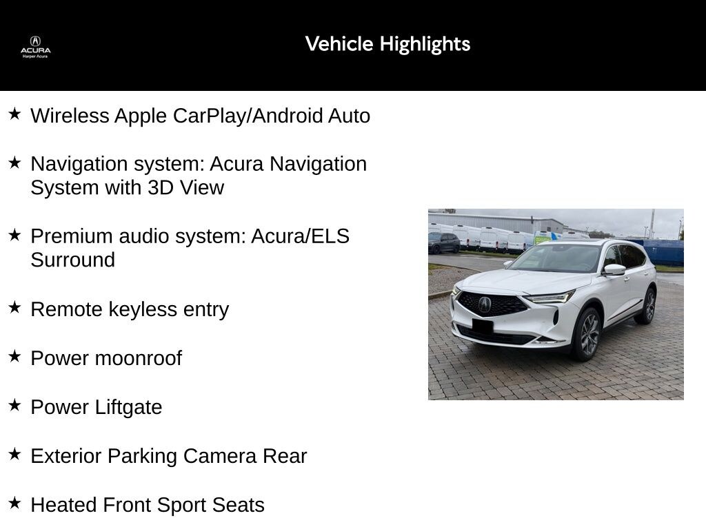 HARPER ACURA believes in the quality of the vehicles we sell so well that we provide an UNLIMITED MILES POWERTRAIN WARRANTY on every new and qualifying pre-owned vehicle it sells!!! This warranty is good at any ASE certified shop in the 48 continental United States!! Check out all these great options Exterior Parking Camera Rear, Heated Front Sport Seats, Navigation system: Acura Navigation System with 3D View, Power Liftgate, Power moonroof, Premium audio system: Acura/ELS Surround, Remote keyless entry, Wheels: 20" x 9J Aluminum Alloy, 12 Speakers, 3rd row seats: split-bench, 4-Wheel Disc Brakes, 4.17 Axle Ratio, A/V remote: CabinControl, ABS brakes, Air Conditioning, Alloy wheels, AM/FM radio: SiriusXM, Anti-whiplash front head restraints, Apple CarPlay/Android Auto, Audio memory, Auto High-beam Headlights, Auto tilt-away steering wheel, Auto-dimming Rear-View mirror, Automatic temperature control, Brake assist, Bumpers: body-color, Compass, Delay-off headlights, Driver door bin, Driver vanity mirror, Dual front impact airbags, Dual front side impact airbags, Electronic Stability Control, Emergency communication system: AcuraLink, Four wheel independent suspension, Front anti-roll bar, Front Bucket Seats, Front Center Armrest, Front dual zone A/C, Front reading lights, Fully automatic headlights, Garage door transmitter: HomeLink, Heated door mirrors, Heated front seats, HVAC memory, Illuminated entry, Knee airbag, Lane departure: Lane Keeping Assist System (LKAS) active, Leather steering wheel, Low tire pressure warning, Memory seat, Occupant sensing airbag, Outside temperature display, Overhead airbag, Overhead console, Panic alarm, Passenger door bin, Passenger vanity mirror, Perforated Premium Milano Leather Trimmed Seats, Power door mirrors, Power driver seat, Power passenger seat, Power steering, Power windows, Radio data system, Radio: ELS Studio Premium Audio System, Rain sensing wipers, Rear air conditioning, Rear anti-roll bar, Rear reading lights, Rear seat center armrest, Rear window defroster, Rear window wiper, Security system, Speed control, Speed-sensing steering, Speed-Sensitive Wipers, Split folding rear seat, Spoiler, Steering wheel memory, Steering wheel mounted audio controls, Tachometer, Telescoping steering wheel, Tilt steering wheel, Traction control, Trip computer, Turn signal indicator mirrors, and Variably intermittent wipers. Certified.