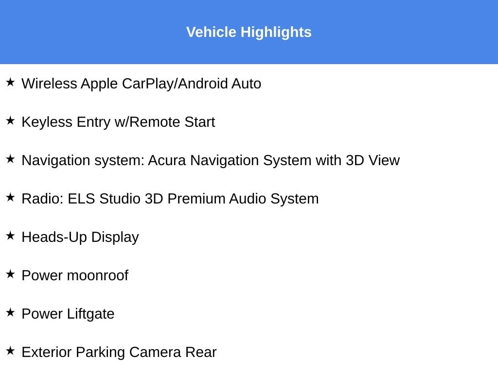 HARPER ACURA believes in the quality of the vehicles we sell so well that we provide an UNLIMITED MILES POWERTRAIN WARRANTY on every new and qualifying pre-owned vehicle it sells!!! This warranty is good at any ASE certified shop in the 48 continental United States!! Check out all these great options Exterior Parking Camera Rear, Heads-Up Display, Heated & Ventilated Front Sport Seats, Heated rear seats, Heated steering wheel, Navigation system: Acura Navigation System with 3D View, Power Liftgate, Power moonroof, Radio: ELS Studio 3D Premium Audio System, Wheels: 19" x 8.0J Berlina Black Machine-Finished, 16 Speakers, 4-Wheel Disc Brakes, ABS brakes, Adaptive suspension, Air Conditioning, Alloy wheels, AM/FM radio: SiriusXM, Apple CarPlay/Android Auto, Auto High-beam Headlights, Auto-dimming Rear-View mirror, Automatic temperature control, Brake assist, Bumpers: body-color, Compass, Delay-off headlights, Driver door bin, Driver vanity mirror, Dual front impact airbags, Dual front side impact airbags, Electronic Stability Control, Emergency communication system: AcuraLink, Four wheel independent suspension, Front anti-roll bar, Front Bucket Seats, Front Center Armrest, Front dual zone A/C, Front fog lights, Front reading lights, Fully automatic headlights, Garage door transmitter: HomeLink, Genuine wood dashboard insert, Genuine wood door panel insert, Heated door mirrors, Heated front seats, Illuminated entry, Knee airbag, Lane departure: Lane Keeping Assist System (LKAS) active, Low tire pressure warning, Memory seat, Occupant sensing airbag, Outside temperature display, Overhead airbag, Overhead console, Panic alarm, Passenger door bin, Passenger vanity mirror, Perforated Milano Premium Leather-Trimmed Interior, Power door mirrors, Power driver seat, Power passenger seat, Power steering, Power windows, Radio data system, Rain sensing wipers, Rear anti-roll bar, Rear reading lights, Rear seat center armrest, Rear window defroster, Rear window wiper, Remote keyless entry, Security system, Speed control, Speed-sensing steering, Split folding rear seat, Spoiler, Steering wheel mounted audio controls, Tachometer, Telescoping steering wheel, Tilt steering wheel, Traction control, Trip computer, Turn signal indicator mirrors, Variably intermittent wipers, and Ventilated front seats.