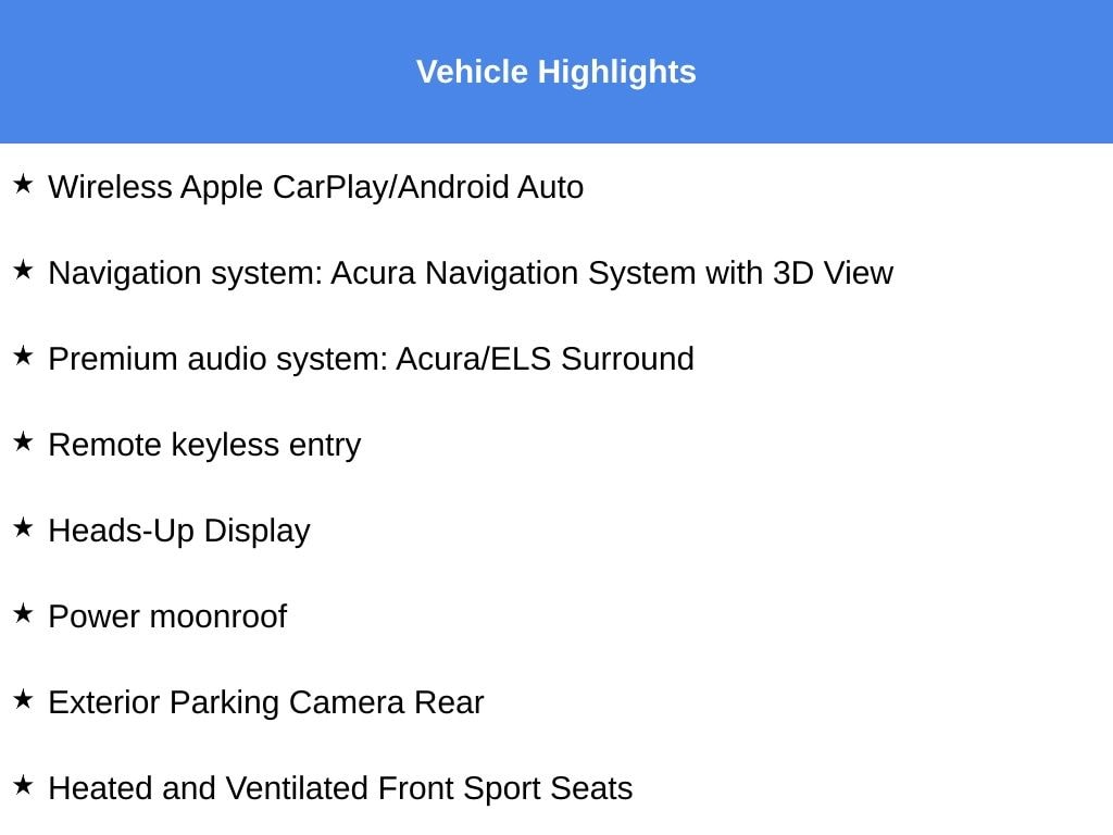 The interior of the TLX Type S is a symphony of premium materials and advanced technology. The Acura Navigation System with 3D View, Acura/ELS Surround Premium Audio System, and Heads-Up Display keep you connected and informed, while the heated and ventilated front sport seats provide unparalleled comfort. The Wireless Apple CarPlay and Android Auto integration seamlessly integrate your smartphone, allowing you to access your favorite apps and content on the go.