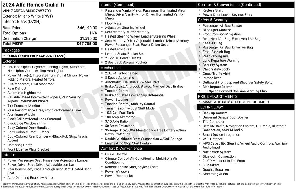 The Giulia Ti's Quick Order Package 22G delivers an impressive array of features that elevate your driving experience. Indulge in the convenience of the 8.8" Navigation system, the clarity of the 8-speaker audio system, and the comfort of the dual-zone automatic climate control. The leather-wrapped steering wheel and shift knob add a touch of sophistication, while the power driver's seat and heated front seats ensure your utmost comfort.
