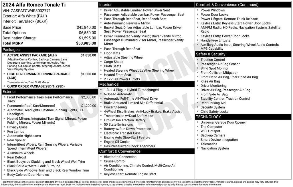 Check out all these great options Active Assist Package (DISC) (Active Driving Assist System, Auto-Dimming Rear Exterior Mirrors, ParkSense Front/Rear/Side Park Assist, and Surround View Camera System), High Performance Driving Package (Aluminum Steering Column Mounted Paddle Shifters, Bright Pedals, and Red Brembo Calipers w/White Script), Quick Order Package 28D Ti, 4-Wheel Disc Brakes, 6 Speakers, ABS brakes, Air Conditioning, Alloy wheels, AM/FM radio: SiriusXM, Anti-whiplash front head restraints, Apple CarPlay/Android Auto, Auto High-beam Headlights, Auto-dimming Rear-View mirror, Automatic temperature control, Brake assist, Bumpers: body-color, Delay-off headlights, Dual front impact airbags, Dual front side impact airbags, Electronic Stability Control, Emergency communication system, Four wheel independent suspension, Front anti-roll bar, Front Bucket Seats, Front dual zone A/C, Front fog lights, Fully automatic headlights, Garage door transmitter, Heated door mirrors, Heated front seats, Heated steering wheel, Knee airbag, Leather steering wheel, Low tire pressure warning, Navigation System, Occupant sensing airbag, Outside temperature display, Overhead airbag, Panic alarm, ParkView Rear Back-Up Camera, Power door mirrors, Power driver seat, Power Liftgate, Power Moonroof, Power passenger seat, Power steering, Power windows, Radio: Uconnect 5 Nav w/10.25" Display, Rain sensing wipers, Rear anti-roll bar, Rear window defroster, Rear window wiper, Remote keyless entry, Security system, Split folding rear seat, Spoiler, Sport Cloth Seat w/Biscotto Stitching, Sport steering wheel, Steering wheel mounted audio controls, Tachometer, Telescoping steering wheel, Tilt steering wheel, Traction control, Trip computer, Variably intermittent wipers, Wheels: 20" x 8.0" Grigio 5-Hole, Compass, Driver door bin, Driver vanity mirror, Front Center Armrest w/Storage, Front readin