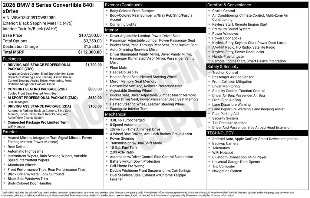 As a one-owner vehicle with low mileage, this 2026 BMW 8 Series 840i represents an exceptional opportunity to own a truly remarkable automobile. We invite you to experience the power, luxury, and technology that this stunning 840i has to offer. Schedule a test drive today and let us demonstrate why this vehicle is the perfect choice for the discerning driver.