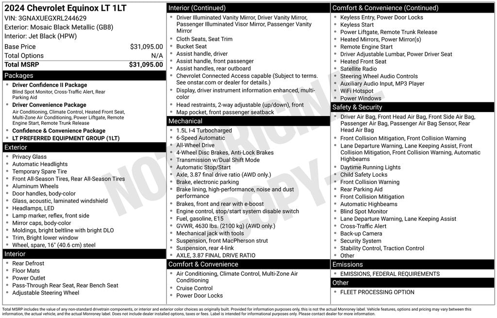 Check out all these great options Preferred Equipment Group 1LT, 2 Rear USB Charging-Only Ports, 2 USB Ports & Auxiliary Input Jack, 2-Way Power Driver Lumbar Control Seat Adjuster, 4-Wheel Disc Brakes, 6-Speaker Audio System Feature, ABS brakes, Air Conditioning, Alloy wheels, AM/FM radio: SiriusXM, Automatic temperature control, Bluetooth® For Phone, Brake assist, Bumpers: body-color, Driver 8-Way Power Seat Adjuster, Dual front impact airbags, Dual front side impact airbags, Electronic Stability Control, Emergency communication system: OnStar and Chevrolet connected services capable, Four wheel independent suspension, Front anti-roll bar, Front Bucket Seats, Front dual zone A/C, Front Passenger 4-Way Manual Seat Adjuster, Fully automatic headlights, Heated door mirrors, Heated Driver & Front Passenger Seats, Heated front seats, Low tire pressure warning, Occupant sensing airbag, Overhead airbag, Panic alarm, Power door mirrors, Power driver seat, Power Liftgate, Power steering, Power windows, Premium audio system: Chevrolet Infotainment 3, Radio data system, Radio: Chevrolet Infotainment 3 System w/AM/FM, Rear anti-roll bar, Rear window defroster, Rear window wiper, Remote keyless entry, Security system, SiriusXM, Split folding rear seat, Steering wheel mounted audio controls, Telescoping steering wheel, Tilt steering wheel, Traction control, Variably intermittent wipers, 3.87 Final Drive Axle Ratio, 6 Speakers, Auto High-beam Headlights, Compass, Delay-off headlights, Driver door bin, Driver vanity mirror, Front Center Armrest, Front reading lights, Illuminated entry, Outside temperature display, Overhead console, Passenger door bin, Passenger vanity mirror, Premium Cloth Seat Trim, Rear reading lights, Rear seat center armrest, Speed control, Speed-sensing steering, Spoiler, Tachometer, and Trip computer. Harper Maserati is very proud to offer this wonderful 2024 Chevrolet Equinox in Mosaic Black Metallic This vehicle has passed our comprehensive inspection and comes with the following features;