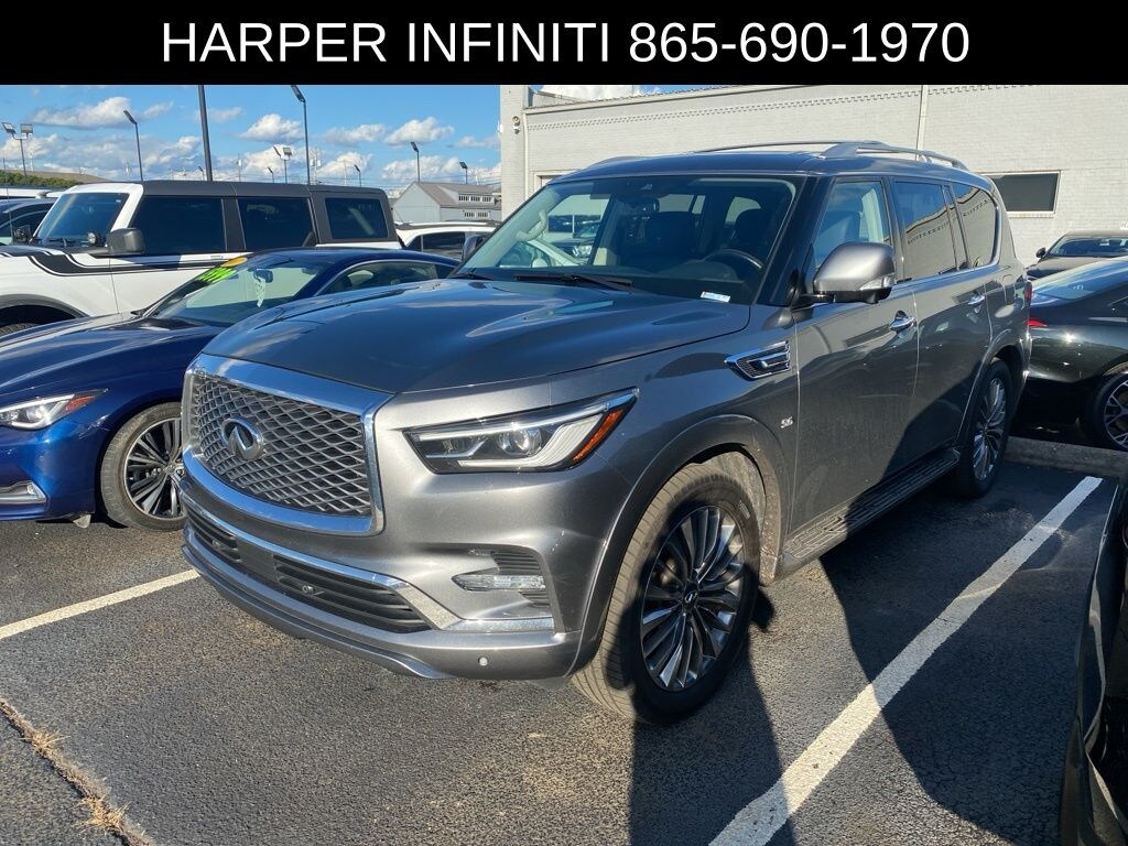 Harper INFINITI is very proud to offer this fantastic-looking 2018 INFINITI QX80 in Graphite Shadow HARPER INFINITI believes in the quality of the vehicles we sell so well that we provide an UNLIMITED MILES, POWERTRAIN WARRANTY on every new and qualifying pre-owned vehicle it sells!!! This warranty is good at any ASE certified shop in the 48 continental United States!! Check out all these great options Driver Assistance Package (Backup Collision Intervention (BCI), Blind Spot Intervention (BSI), Blind Spot Warning, Intelligent Cruise Control (Full-Speed Range), and Lane Departure Warning System), Theater Package (120V Power Outlet, Dual 8" Color Monitors, Heated 2nd-Row Seats, and Wireless Headphones (2)), Tire & Wheel Package (Wheels: 22" x 8.0" 14-Spoke Forged Aluminum-Alloy), Navigation System, 13 Speakers, 2.94 Axle Ratio, 3rd row seats: split-bench, 4-Wheel Disc Brakes, ABS brakes, Air Conditioning, Alloy wheels, AM/FM radio: SiriusXM, Anti-whiplash front head restraints, Auto High-beam Headlights, Auto tilt-away steering wheel, Auto-dimming door mirrors, Auto-dimming Rear-View mirror, Auto-leveling suspension, Automatic temperature control, Brake assist, Bumpers: body-color, Carpeted Cargo Mat/Cargo Net & First Aid Kit, CD player, Delay-off headlights, Driver door bin, Driver vanity mirror, Dual front impact airbags, Dual front side impact airbags, Electronic Stability Control, Emergency communication system: INFINITI Connection, Four wheel independent suspension, Front anti-roll bar, Front Bucket Seats, Front Center Armrest, Front dual zone A/C, Front fog lights, Front reading lights, Fully automatic headlights, Garage door transmitter: HomeLink, Genuine wood console insert, Genuine wood dashboard insert, Genuine wood door panel insert, Heated door mirrors, Heated Front Bucket Seats, Heated front seats, Heated steering wheel, Illuminated entry, INFINITI Radiant Illuminated Kick Plates, Leather Shift Knob, Leather steering wheel, Leather-Appointed Seats w/Stratford Burl Trim, Low tire pressure warning, Memory seat, Occupant sensing airbag, Outside temperature display, Overhead airbag, Overhead console, Panic alarm, Passenger door bin, Passenger vanity mirror, Power door mirrors, Power driver seat, Power Liftgate, Power moonroof, Power passenger seat, Power steering, Power windows, Radio data system, Radio: AM/FM/HD Single In-Dash CD/DVD Player w/MP3, Rain sensing wipers, Rear air conditioning, Rear anti-roll bar, Rear audio controls, Rear reading lights, Rear seat center armrest, Rear window defroster, Rear window wiper, Reclining 3rd row seat, Remote keyless entry, Roof rack: rails only, Roof Rail Crossbars, Security system, Speed control, Speed-sensing steering, Split folding rear seat, Spoiler, Steering wheel memory, Steering wheel mounted audio controls, Tachometer, Telescoping steering wheel, Tilt steering wheel, Traction control, Trip computer, Turn signal indicator mirrors, Variably intermittent wipers, Voltmeter, and Wheels: 20" x 8.0" Split 6-Spoke Aluminum-Alloy.