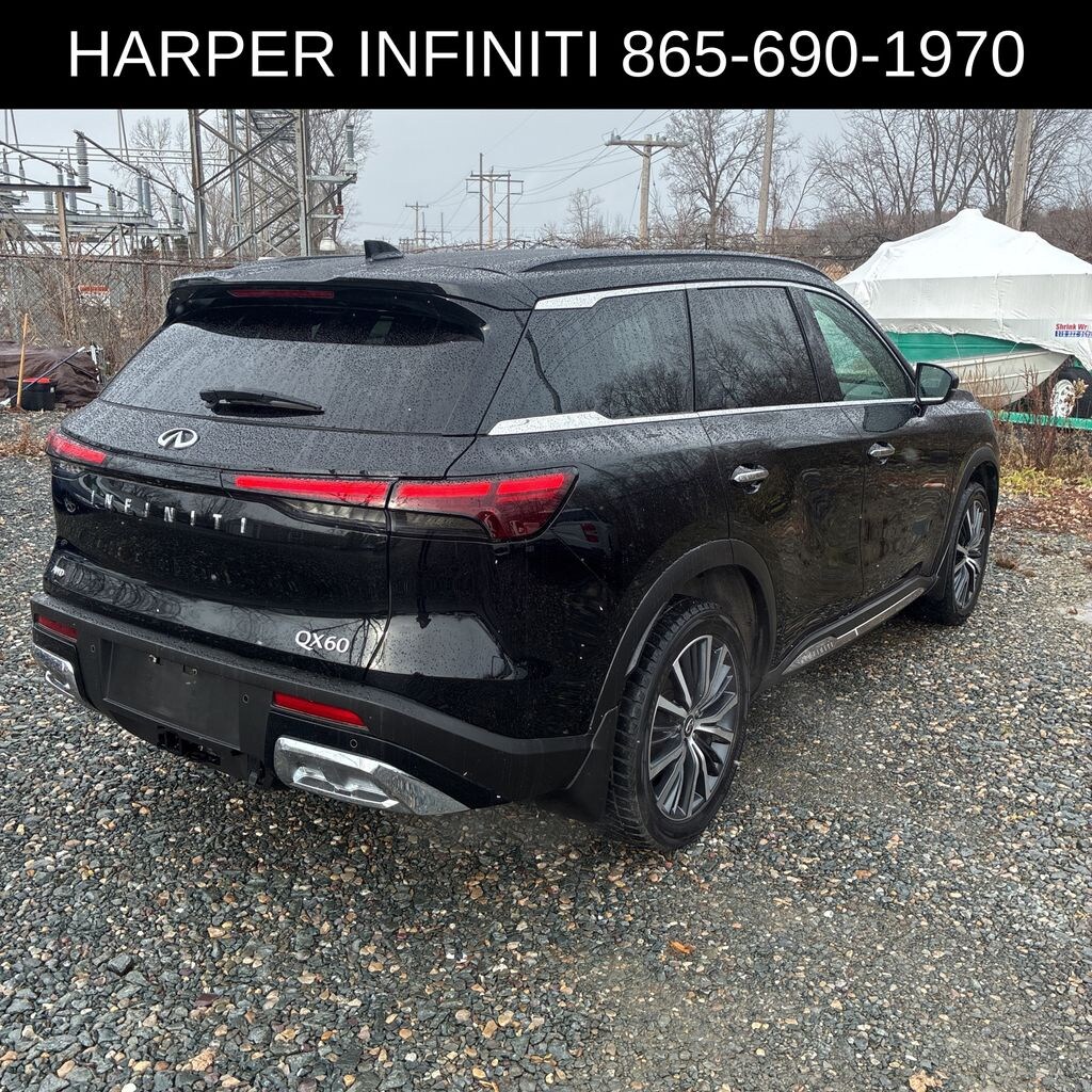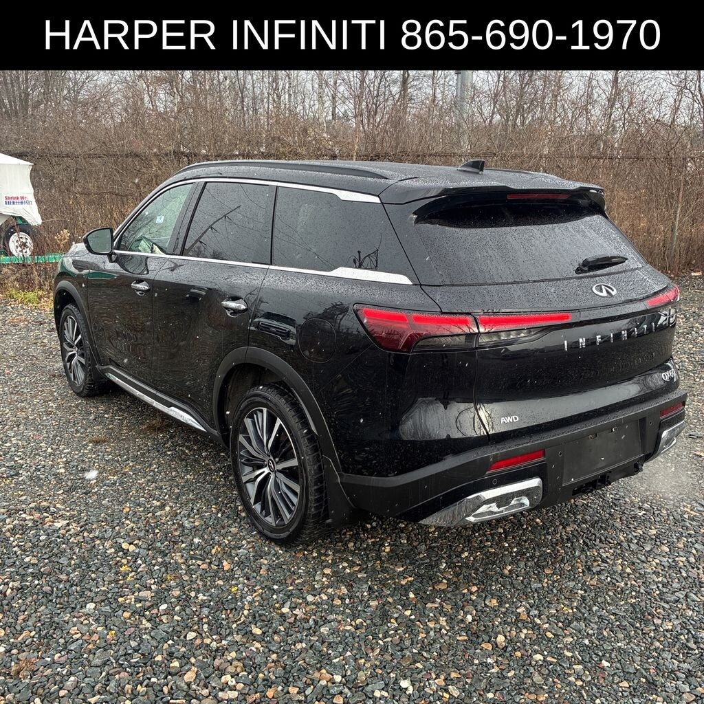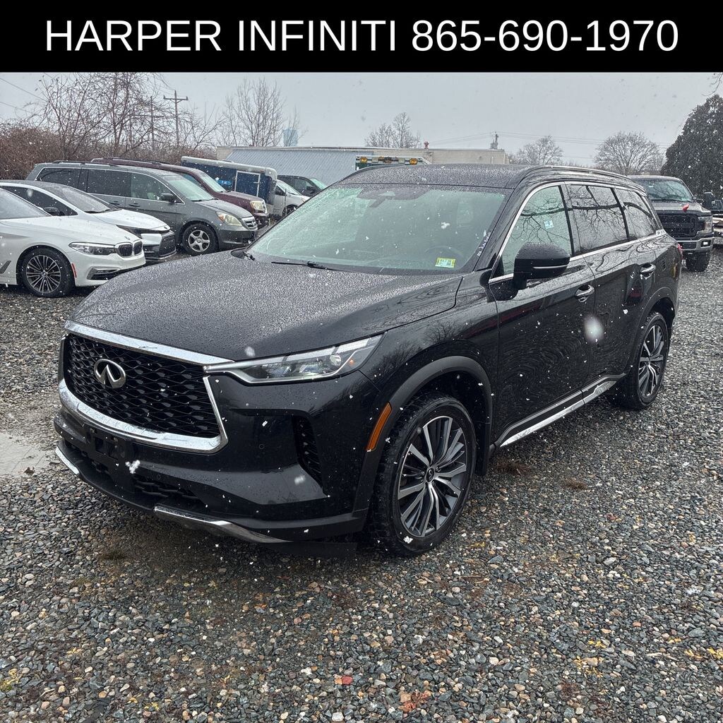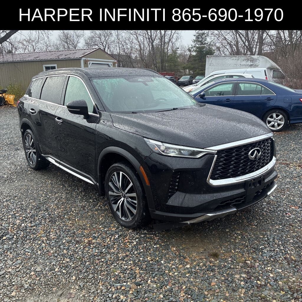 Harper INFINITI is very proud to offer this beautiful-looking 2022 INFINITI QX60 in Mineral Black HARPER INFINITI believes in the quality of the vehicles we sell so well that we provide an UNLIMITED MILES, POWERTRAIN WARRANTY on every new and qualifying pre-owned vehicle it sells!!! This warranty is good at any ASE certified shop in the 48 continental United States!! Check out all these great options 17 Speakers, 3rd row seats: bench, 4-Wheel Disc Brakes, 4.334 Axle Ratio, ABS brakes, Air Conditioning, Alloy wheels, AM/FM radio: SiriusXM, Anti-whiplash front head restraints, Auto High-beam Headlights, Auto-dimming door mirrors, Auto-dimming Rear-View mirror, Automatic temperature control, Bose Performance Series 17-Speaker Sound System, Brake assist, Bumpers: body-color, Delay-off headlights, Driver door bin, Driver vanity mirror, Dual front impact airbags, Dual front side impact airbags, Electronic Stability Control, Emergency communication system, Floor Mats on Captains Chair w/3rd Row Tray, Four wheel independent suspension, Front anti-roll bar, Front Bucket Seats, Front Center Armrest, Front dual zone A/C, Front reading lights, Fully automatic headlights, Garage door transmitter: HomeLink, Heads-Up Display, Heated & Cooled Front Bucket Seats, Heated door mirrors, Heated front seats, Heated rear seats, Heated steering wheel, Illuminated entry, Illuminated Kick Plates, Knee airbag, Leather Shift Knob, Leather steering wheel, Literature Kit, Low tire pressure warning, Memory seat, Navigation system: INFINITI InTouch Navigation, Occupant sensing airbag, Outside temperature display, Overhead airbag, Overhead console, Panic alarm, Passenger door bin, Passenger vanity mirror, Power door mirrors, Power driver seat, Power Liftgate, Power moonroof, Power passenger seat, Power steering, Power windows, Radio data system, Radio: AM/FM Audio System, Rain sensing wipers, Rear air conditioning, Rear anti-roll bar, Rear reading lights, Rear side impact airbag, Rear window defroster, Rear window wiper, Reclining 3rd row seat, Remote keyless entry, Roof rack: rails only, Security system, Semi Aniline Leather Seating Surfaces, Speed control, Speed-sensing steering, Speed-Sensitive Wipers, Splash Guards, Split folding rear seat, Spoiler, Steering wheel memory, Steering wheel mounted audio controls, Tachometer, Telescoping steering wheel, Tilt steering wheel, Traction control, Trip computer, Turn signal indicator mirrors, Variably intermittent wipers, Ventilated front seats, and Wheels: 20" x 8J Luxury Machined Aluminum Alloy.