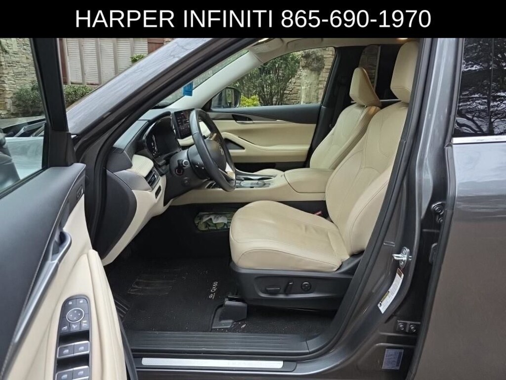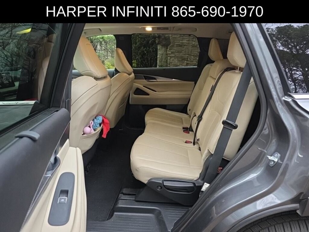 Harper INFINITI is excited to offer this attractive 2023 INFINITI QX60 in Graphite Shadow HARPER INFINITI believes in the quality of the vehicles we sell so well that we provide an UNLIMITED MILES, POWERTRAIN WARRANTY on every new and qualifying pre-owned vehicle it sells!!! This warranty is good at any ASE certified shop in the 48 continental United States!! Check out all these great options Cargo Package (Cargo Mat (Reversible) and First Aid Kit), 3rd row seats: bench, 4-Wheel Disc Brakes, 4.334 Axle Ratio, 9 Speakers, ABS brakes, Air Conditioning, Alloy wheels, AM/FM radio: SiriusXM, Anti-whiplash front head restraints, Auto High-beam Headlights, Auto-dimming door mirrors, Auto-dimming Rear-View mirror, Automatic temperature control, Brake assist, Bumpers: body-color, Climate-Controlled Front Bucket Seats, Delay-off headlights, Driver door bin, Driver vanity mirror, Dual front impact airbags, Dual front side impact airbags, Electronic Stability Control, Emergency communication system, Floor Mats on Bench Seats w/3rd Row Tray, Four wheel independent suspension, Front anti-roll bar, Front Bucket Seats, Front Center Armrest, Front dual zone A/C, Front reading lights, Fully automatic headlights, Garage door transmitter: HomeLink, Heated door mirrors, Heated front seats, Heated steering wheel, Illuminated entry, Knee airbag, Leather Shift Knob, Leather steering wheel, Leather-Appointed Seating Surfaces, Literature Kit, Low tire pressure warning, Memory seat, Navigation system: INFINITI InTouch Navigation, Occupant sensing airbag, Outside temperature display, Overhead airbag, Overhead console, Panic alarm, Passenger door bin, Passenger vanity mirror, Power door mirrors, Power driver seat, Power Liftgate, Power moonroof, Power passenger seat, Power steering, Power windows, Radio data system, Radio: AM/FM Audio System, Rain sensing wipers, Rear air conditioning, Rear anti-roll bar, Rear reading lights, Rear seat center armrest, Rear side impact airbag, Rear window defroster, Rear window wiper, Reclining 3rd row seat, Remote keyless entry, Security system, Speed control, Speed-sensing steering, Speed-Sensitive Wipers, Splash Guards, Split folding rear seat, Spoiler, Steering wheel memory, Steering wheel mounted audio controls, Tachometer, Telescoping steering wheel, Tilt steering wheel, Traction control, Trip computer, Turn signal indicator mirrors, Variably intermittent wipers, Ventilated front seats, and Wheels: 20" x 8J Sporty Machined Aluminum Alloy.