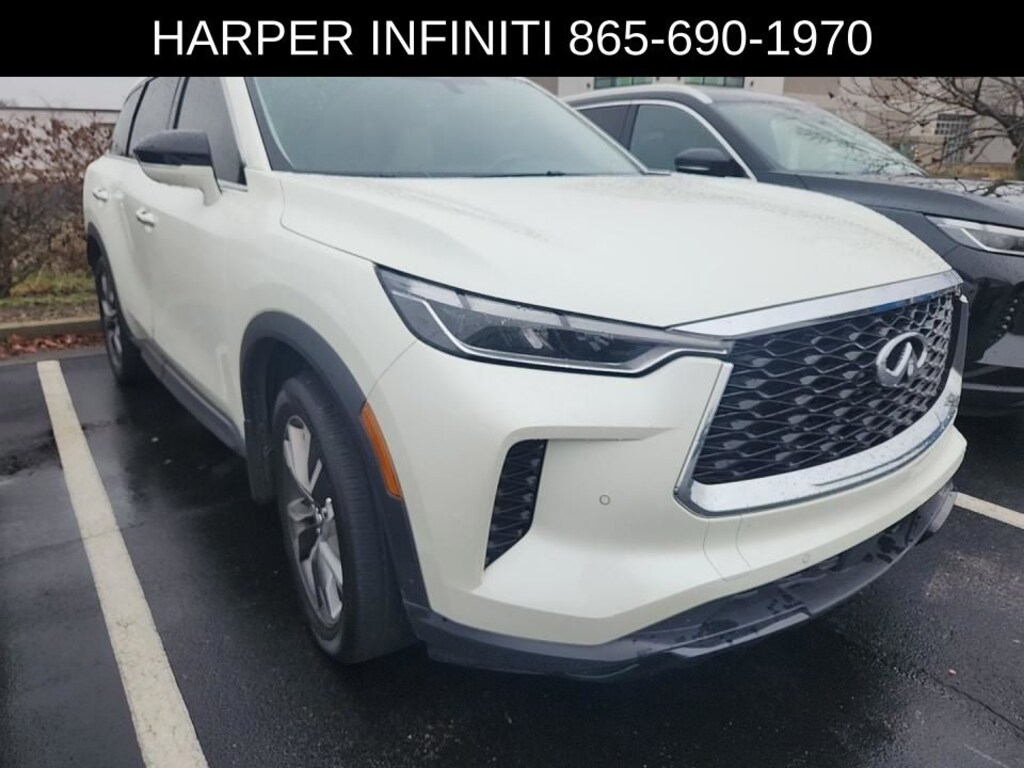 Harper INFINITI is pumped up to offer this handsome-looking 2023 INFINITI QX60 in Majestic White HARPER INFINITI believes in the quality of the vehicles we sell so well that we provide an UNLIMITED MILES, POWERTRAIN WARRANTY on every new and qualifying pre-owned vehicle it sells!!! This warranty is good at any ASE certified shop in the 48 continental United States!! Check out all these great options Navigation system: INFINITI InTouch Navigation, 3rd row seats: bench, 4-Wheel Disc Brakes, 4.334 Axle Ratio, 9 Speakers, ABS brakes, Air Conditioning, Alloy wheels, AM/FM radio: SiriusXM, Anti-whiplash front head restraints, Auto High-beam Headlights, Auto-dimming door mirrors, Auto-dimming Rear-View mirror, Automatic temperature control, Brake assist, Bumpers: body-color, Climate-Controlled Front Bucket Seats, Delay-off headlights, Driver door bin, Driver vanity mirror, Dual front impact airbags, Dual front side impact airbags, Electronic Stability Control, Emergency communication system, Floor Mats on Bench Seats w/3rd Row Tray, Four wheel independent suspension, Front anti-roll bar, Front Bucket Seats, Front Center Armrest, Front dual zone A/C, Front reading lights, Fully automatic headlights, Garage door transmitter: HomeLink, Heated door mirrors, Heated front seats, Heated steering wheel, Illuminated entry, Knee airbag, Leather Shift Knob, Leather steering wheel, Leather-Appointed Seating Surfaces, Literature Kit, Low tire pressure warning, Memory seat, Occupant sensing airbag, Outside temperature display, Overhead airbag, Overhead console, Panic alarm, Passenger door bin, Passenger vanity mirror, Power door mirrors, Power driver seat, Power Liftgate, Power moonroof, Power passenger seat, Power steering, Power windows, Radio data system, Radio: AM/FM Audio System, Rain sensing wipers, Rear air conditioning, Rear anti-roll bar, Rear reading lights, Rear seat center armrest, Rear side impact airbag, Rear window defroster, Rear window wiper, Reclining 3rd row seat, Remote keyless entry, Security system, Speed control, Speed-sensing steering, Speed-Sensitive Wipers, Splash Guards, Split folding rear seat, Spoiler, Steering wheel memory, Steering wheel mounted audio controls, Tachometer, Telescoping steering wheel, Tilt steering wheel, Traction control, Trip computer, Turn signal indicator mirrors, Variably intermittent wipers, Ventilated front seats, and Wheels: 20" x 8J Sporty Machined Aluminum Alloy.