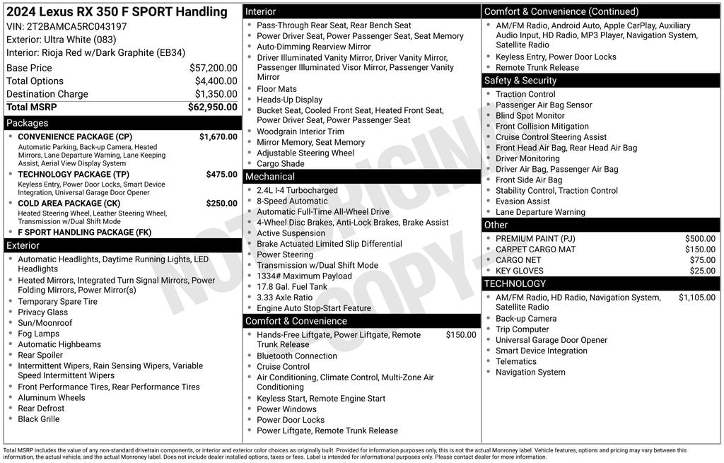 Check out all these great options Cold Area Package (Heated F SPORT Steering Wheel w/Paddle Shifters), Convenience Package (Electrochromic Heated Outside Rearview Mirror and Lane Change Assist w/Lane Keeping Assist System), 12 Speakers, 4-Wheel Disc Brakes, 8-Way Power Driver & Front Passenger Seat Adjusters, ABS brakes, Active Cruise Control, Adaptive suspension, Air Conditioning, Alloy wheels, AM/FM radio: SiriusXM, Anti-whiplash front head restraints, Auto High-beam Headlights, Auto tilt-away steering wheel, Auto-dimming door mirrors, Auto-dimming Rear-View mirror, Auto-leveling suspension, Automatic temperature control, Bumpers: body-color, Compass, Delay-off headlights, Dual front impact airbags, Dual front side impact airbags, Electronic Stability Control, Emergency communication system: Safety Connect (10-year trial), F SPORT NuLuxe Seat Trim, Four wheel independent suspension, Front anti-roll bar, Front dual zone A/C, Front fog lights, Fully automatic headlights, Garage door transmitter: HomeLink, Heads-Up Display, Heated & Ventilated Front Bucket Seats, Heated door mirrors, Heated front seats, Illuminated entry, Leather Shift Knob, Leather steering wheel, Low tire pressure warning, Memory seat, Navigation System, Occupant sensing airbag, Outside temperature display, Overhead airbag, Panic alarm, Power door mirrors, Power driver seat, Power Liftgate, Power moonroof, Power passenger seat, Power steering, Power windows, Radio data system, Radio: Lexus Interface w/14" HD Touchscreen Display, Rain sensing wipers, Rear air conditioning, Rear anti-roll bar, Rear side impact airbag, Rear window defroster, Rear wi