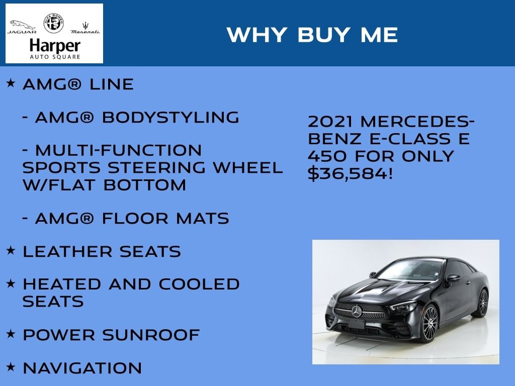 Boasting a 3.0L I6 Turbo engine and 9-Speed Automatic transmission, this E-Class delivers a thrilling driving experience with impressive fuel efficiency of 23 MPG in the city and 31 MPG on the highway. The AMG® Line package further enhances the vehicle's sporty and dynamic appearance, ensuring you command attention wherever you go.